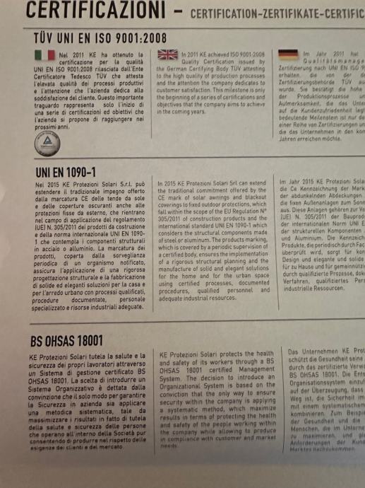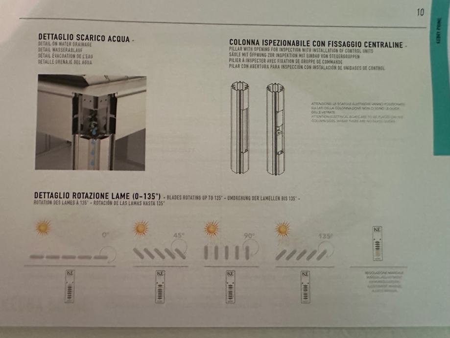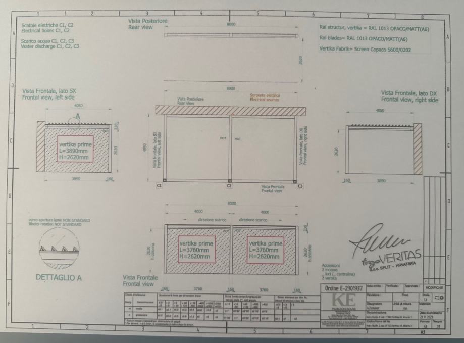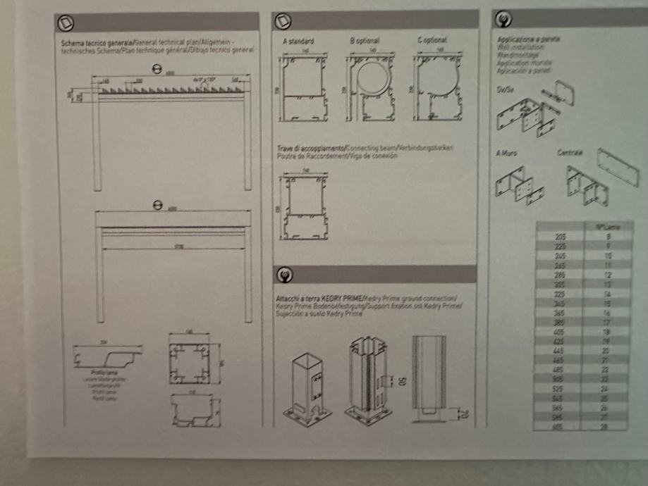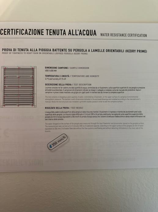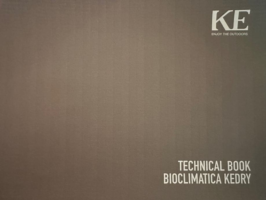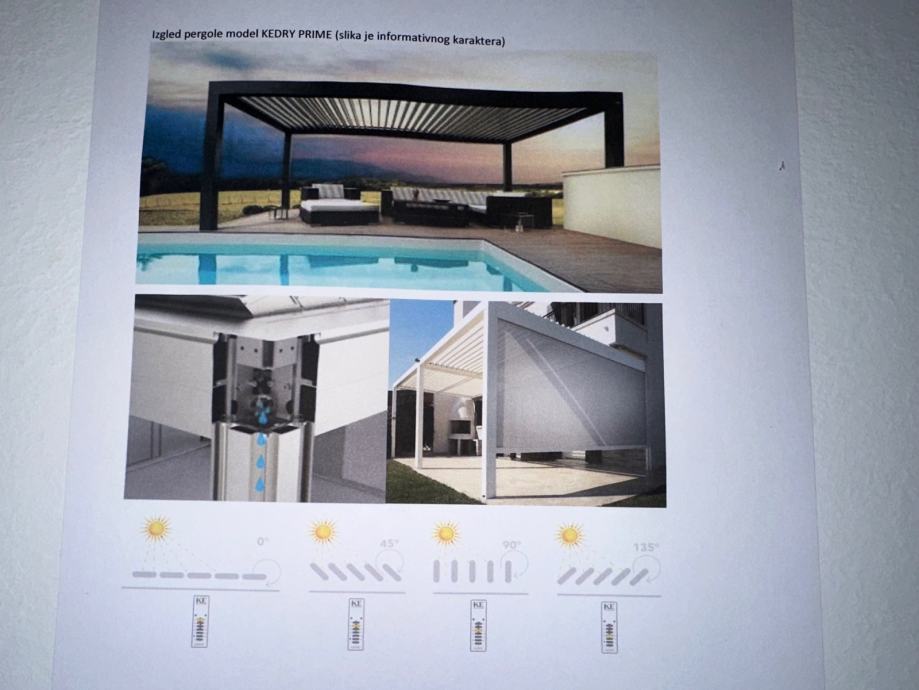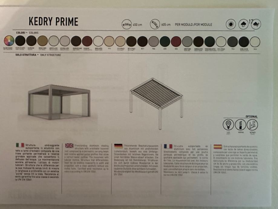 FULL ALIMINIJ BIOKLIMATSKA PERGOLA MODEL KEDRY PRIME s mogućnošću zakretanja lamela do 135° . Sistem s ugrađenim sustavom za odvodnju vode. Boja metalnih dijelova mat 1013. Pokretanje pomoću elektro motora na daljinsko upravljanje marke Somfy iO. Pergola se montira na 3 samo nosiva stupa dim. 16*16 cm, te se oslanja jednom stranom na postojeći objekt. Visina stupova 263 cm. Stavka uključuje senzora za vjetar i LED rasvjetu koje je pokretana pomoću ručnog potenciometra.