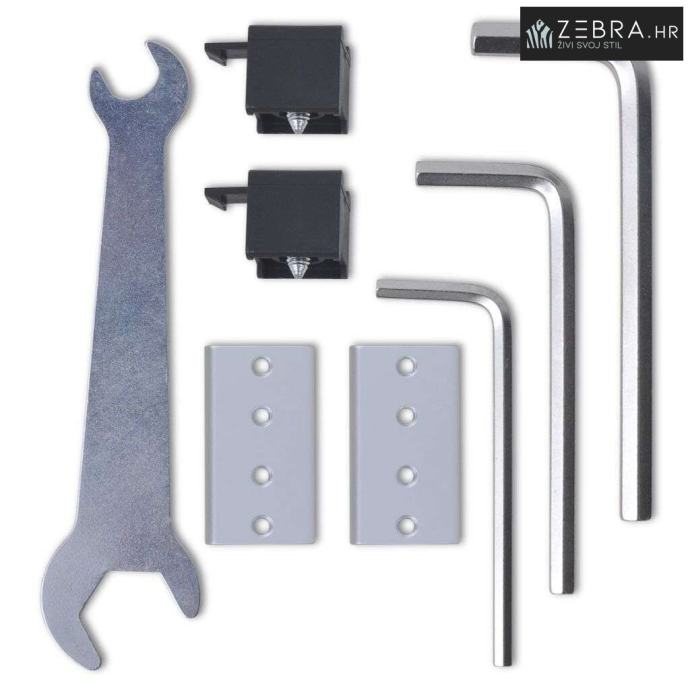 Isporuka uključuje 1 aluminijsku stazu, 3 stakla, 1 pokrovnu traku, 1 podnu vodilicu, 2 graničnika za vrata, 1 kvaku, 2 seta za montažu i 2 priključka za vodilicu.