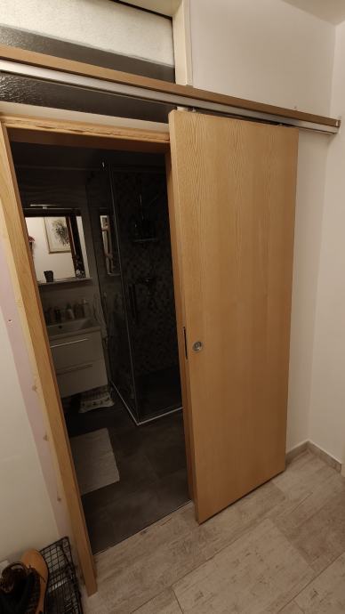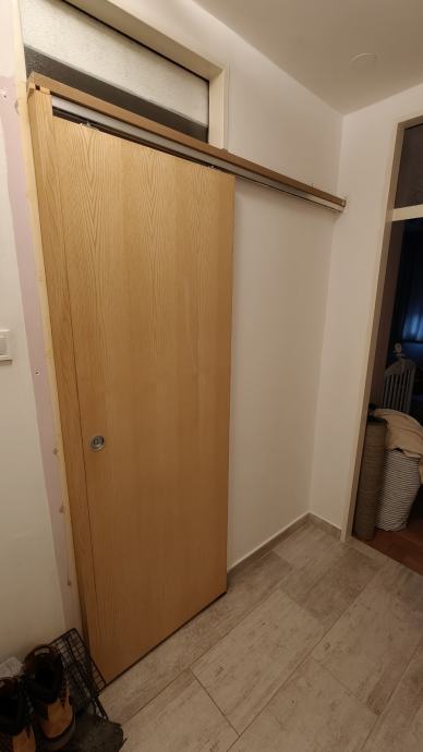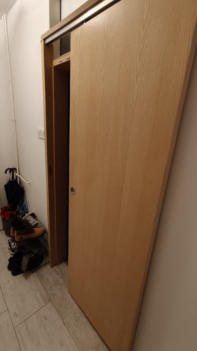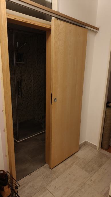 Prodajem klizna vrata,rastavljena,u odlicnom stanju.Vrata (ŠxVxD): 68x200x4.5,Okvir: 65x196.5x13.Prodaje se rastavljeno sa vodilicom