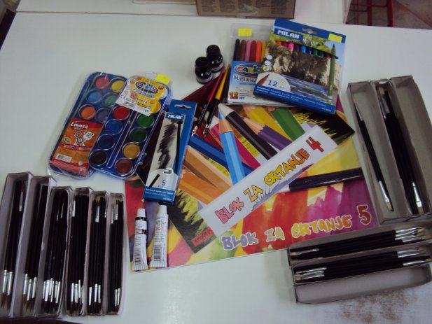 Glinamol bijeli-8,kn/kom, trokuti mali 4kn/kom, trokuti veliki 8kn/kom, pernice ovalne prazne 10kn/kom, pernice pune 70kn, tuš crni 3kn, pero za tuš 3kn, šiljila zatvorena 3kn,kistovi više dimenzija 1kn/kom omoti za knjige frim 2kn/kom, fascikli 5kn/kom, crna 2kn/kom, mapa za herbarij 15kn, plastelin 5kn