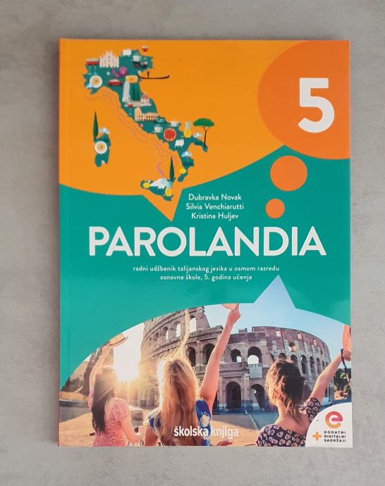 Radni udžbenik Parolandia 5, Školska knjiga, autori: Novak, Venchiarutti, Huljek. Očuvan, djelomično ispunjen olovkom (primjer na slici).