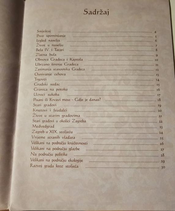 Priručnik služi učenicima za predstavljanje povijesnih zbivanja u Zagrebu. Ilustracije i kratak tekst prate povijesna zbivanja kroz stoljeća. Od prvog spominjanja, života u starom gradu, do provale Tatara, dobivanja titule slobodnog kraljevskog grada, pa sve do zbivanja u 19. stoljeću. Priručnik prikazuje i znamenite osobe u povijesti grada. Na kraju je vremenska lenta koja predočava razvoj grada kroz stoljeća.