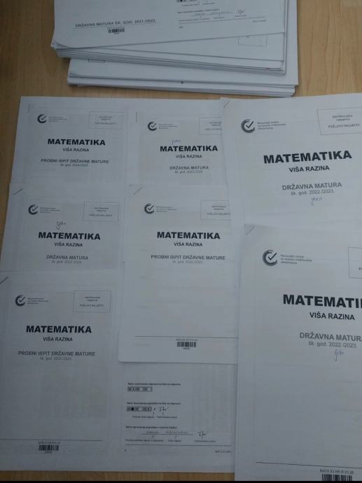 Isprintane mature iz matematike za višu razinu za svaku provedenu maturu od godine 2012/2013. Ukupno ima 27 isprintanih matura (od godine 12/13 do godine 23/24 te tri probne mature za godine 22/23, 23/24 i 24/25). Na svakoj maturi je napisano koja je godina i je li ljetni ili jesenski rok. Neke mature su printane na A4 papiru, neke na A5 papiru kao što je vidljivo na slici.