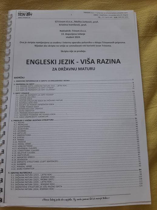 Skripte za maturu iz matematike, fizike, hrvatskog i engleskog. Engleski 10 eura, ostalo 20 eura po komadu.