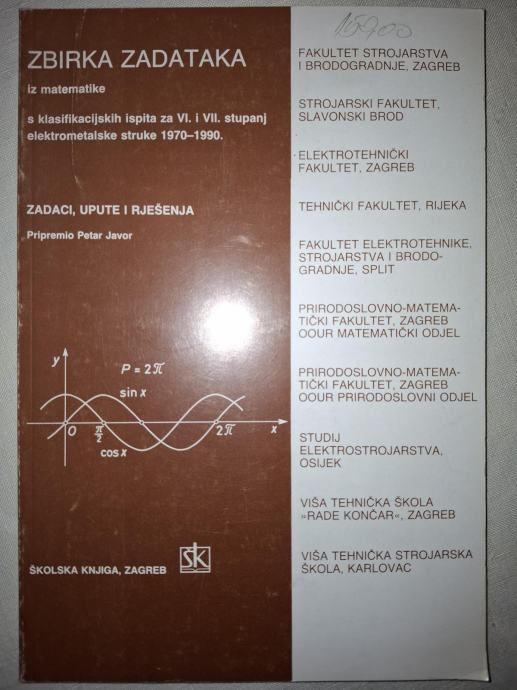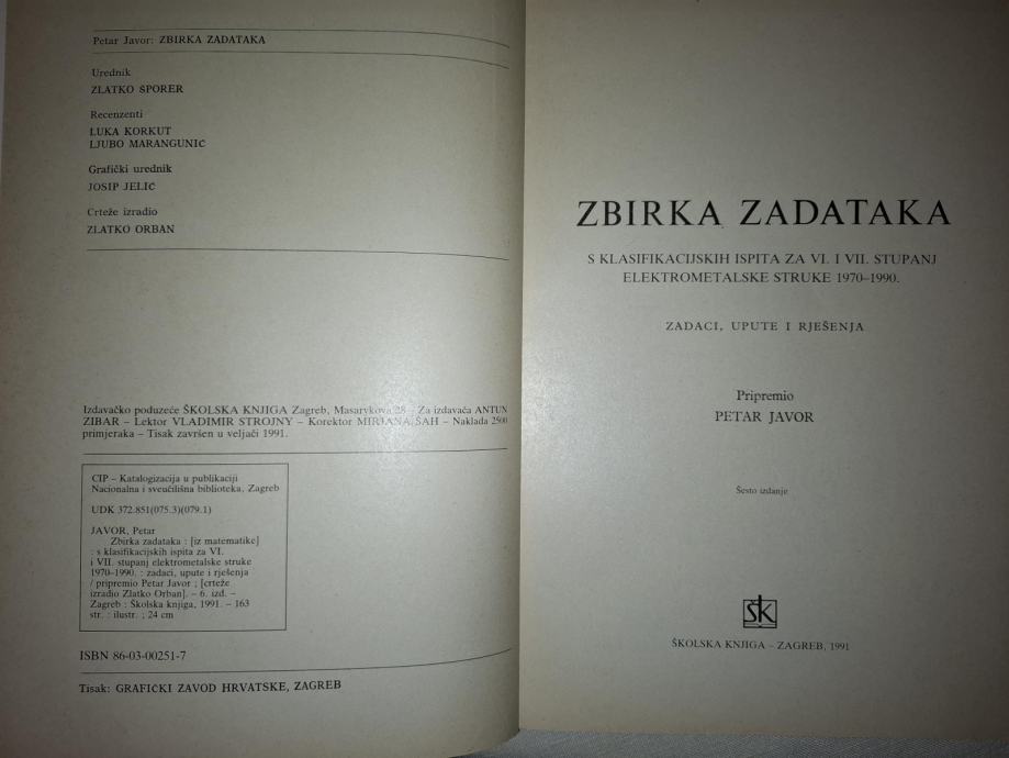 11. Petar Javor: Zbirka zadataka iz matematike s klasifikacijskih ispita za VI. i VII stupanj elektrometalske struke 1970-1990., Školska knjiga, Zagreb, 1991.