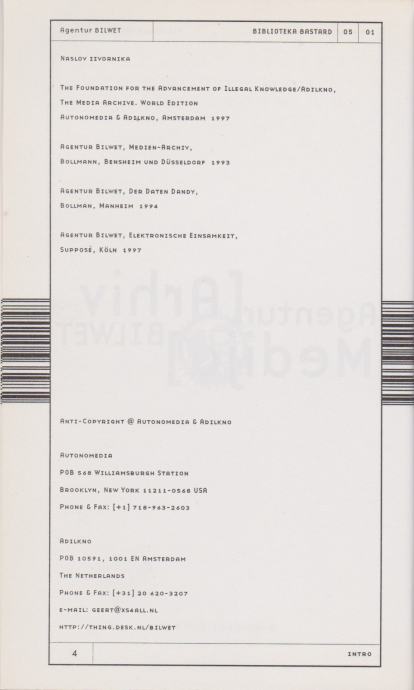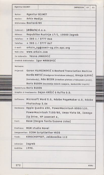 Agentur Bilwet: Arhiv medija, Arkzin, Zagreb 1998.