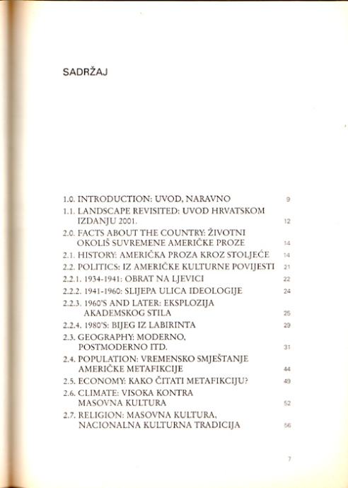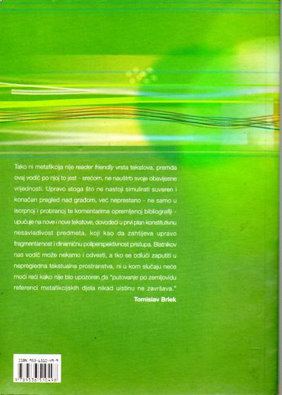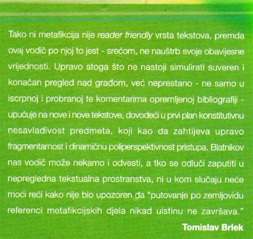 Nazivajući u predgovoru ovu knjigu "faction-fiction koktelom", Blatnik daje pregled onog dijela suvremene američke proze koji se naziva "matafikcija". Riječ je o pojavi koja ima svoj osebujni duhovni horiziont, impliciran američkom kulturnom poviješću, o vrsti autorefleksivne književnosti, u čijem je središtu ontološko promišljanje pisanja. Osim teorijskih odrednica pojma "američka metafikcija", autor ovdje daje popis relevantnih književno-znanstvenih izvora i literature te pedeset proznih djela američkih pisaca, koji se mogu podvesti pod spomenuti termin. Za potrebe ovog 2. izdanja (1. je objavljeno 1994.) navedeni je popis osuvremenjen dodavanjem još pet romana - D. Guterson: "Snow falling on cedars", M. Cunningham: " The hours", J. Heller: "Closing time", P. Auster: "Leviathan" i S. Bellow: "Ravelstein".