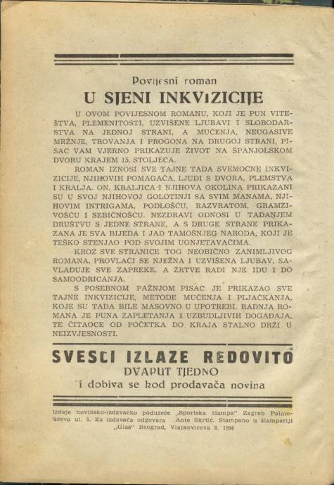 Naslov: U sjeni inkvizicije uvezani roman u nastavcima
