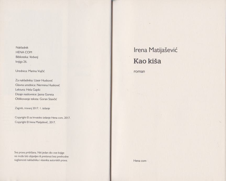 Irena Matijašević: Kao kiša, Hena com, Zagreb 2017.
