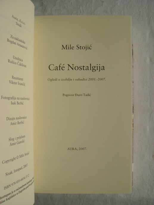 Mile Stojić - Cafe Nostalgija - Ogledi o izobilju i oskudici 2001.-2007. - izdavač Aura Sisak, 2007. godine, 13 x 20 cm, meki uvez sa preklopom, 365 stranica.