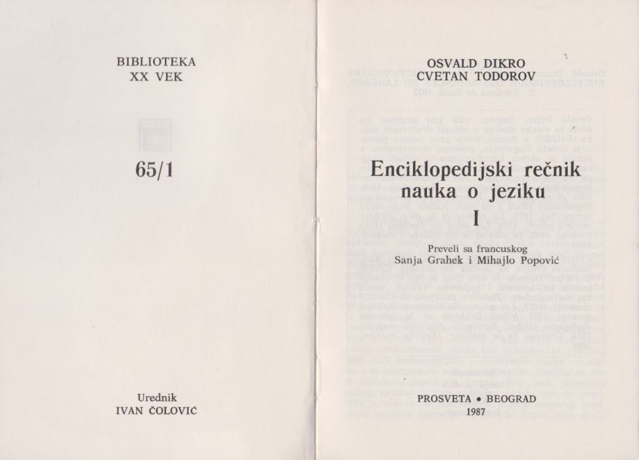 Osvald Dikro/Cvetan Todorov (Oswald Ducrot/Tzvetan Todorov): Enciklopedijski rečnik nauka o jeziku, Prosveta, Beograd 1987.
