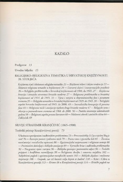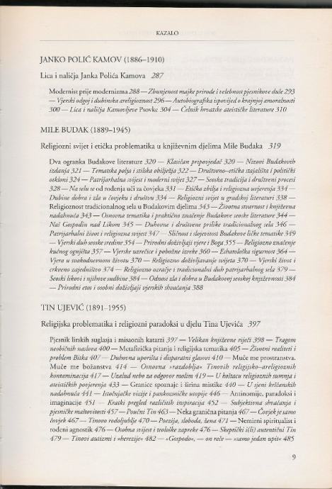 Prvi svezak studiozno prikazuje religioznu problematiku pojedinih razdoblja tijekom 20. stoljeća u hrvatskoj književnosti te tako prati i izlaže složene promjene, prijepore i procese u kontinuiranome povijesnom slijedu duhovnih i kulturnih zbivanja u hrvatskoj književnosti. Predmet knjige je vjera i nevjera u kojoj autor nudi jasan uvid u duhovna i društvena zbivanja u hrvatskome društvu i kulturi, opisujući opširno devet uglednih kanonskih hrvatskih književnika: Silvija Strahimira Kranjčevića, Antuna Gustava Matoša, Milana Begovića, Vladimira Nazora, Janka Polića Kamova, Milu Budaka, Tina Ujevića, Ivu Andrića, Miroslava Krležu. Uz uvodne bilješke, autor raspravlja o složenoj religioznoj tematici u književnosti, ali i o problemu čovjeka koji je s jedne strane postigao visoku svijest o sebi i svojim mogućnostima, a s druge jasnu spoznaju da je ontički nekonzistentan, životno nemiran i sudbinski nesiguran.
