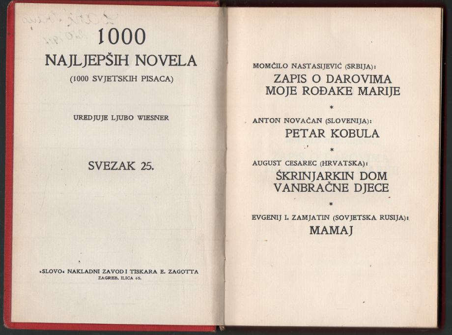 Sadrži: Zapis o darovima moje rođake Marije / Momčilo Nastasijević. Petar Kobula / Anton Novačan. Škrinjarkin dom vanbračne djece / August Cesarec. Mamaj / Evgenij J. Zamjatin.
