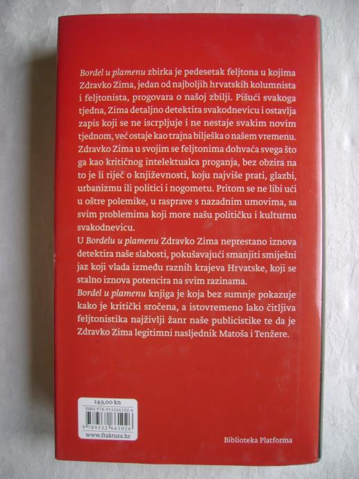 "Bordel u plamenu" knjiga je koja bez sumnje pokazuje kako je kritički sročena, a istovremeno lako čitljiva feljtonistika najživlji žanr naše publicistike te da je Zdravko Zima legitimni nasljednik Matoša i Tenžere."
