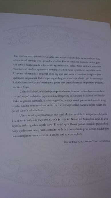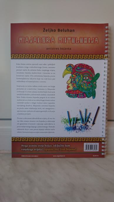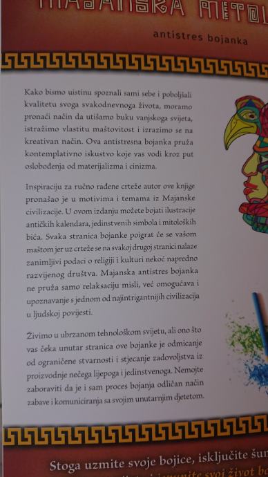 Inspiraciju za ručno rađene crteže autor ove knjige pronašao je u motivima i temama iz Majanske civilizacije. U ovom izdanju možete bojati ilustracije antičkih kalendara, jedinstvenih simbola i mitoloških bića. Svaka stranica bojanke poigrat će se vašom maštom jer uz crteže se na svakoj drugoj stranici nalaze zanimljivi podaci o religiji i kulturi nekoć napredno razvijenog društva. Majanska antistres bojanka ne pruža samo relaksaciju misli, već omogućava i upoznavanje s jednom od najintrigantnijih civilizacija u ljudskoj povijesti.