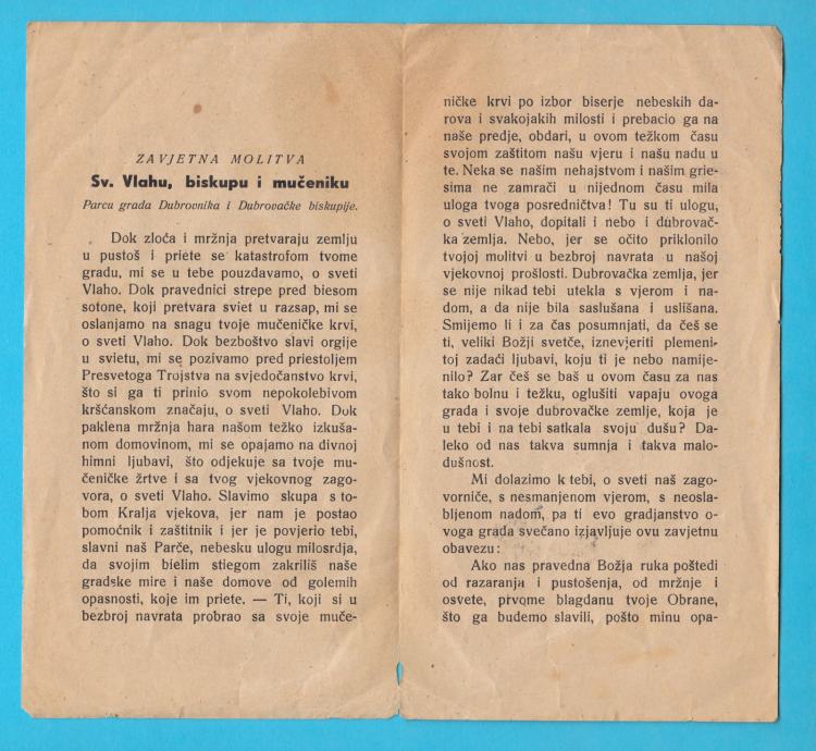 Stara originalna brošura iz ratne 1944. godine - Svečani zavjet Dubrovnika svome zaštitniku Sv. Vlahu.