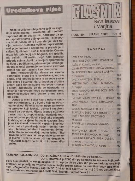 Glasnik SRCA ISUSOVA i MARIJINA 6 , 1989./Gl.ur. : Valentin MIKLOBUŠEC