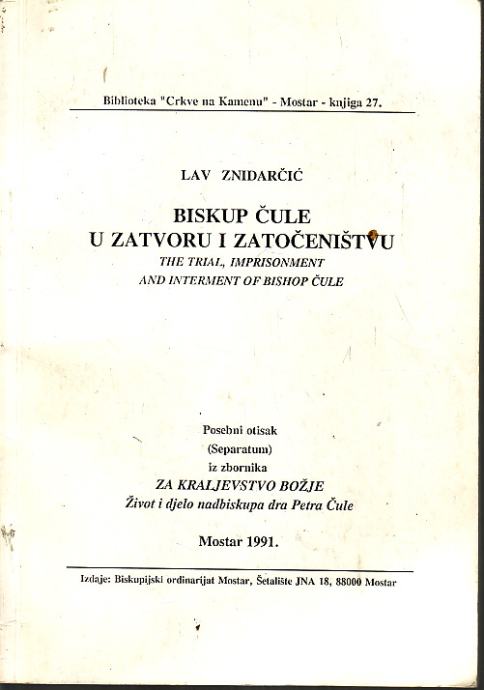 LAV ZNIDARČIĆ : BISKUP ČULE U ZATVORU I ZATOČENIŠTVU - POTPIS AUTORA