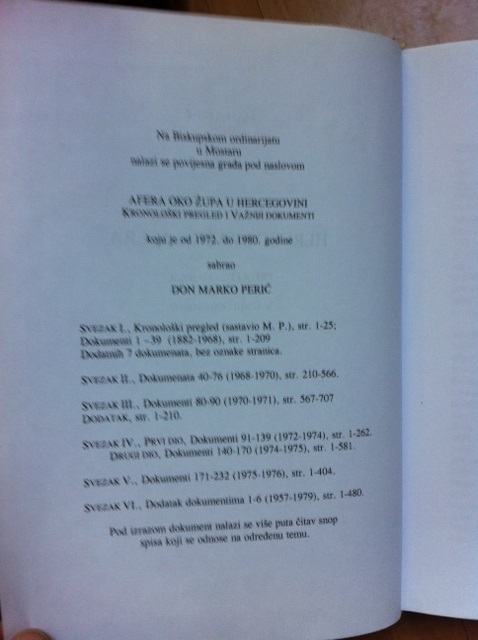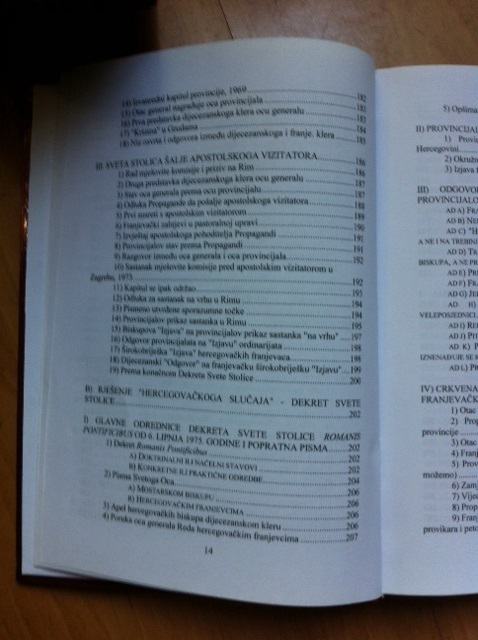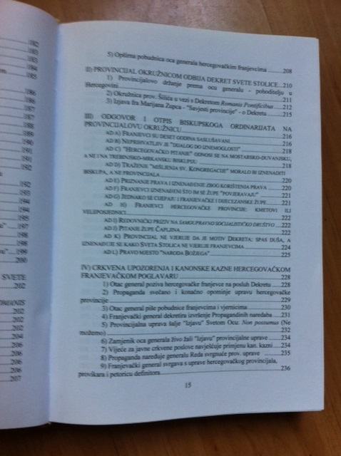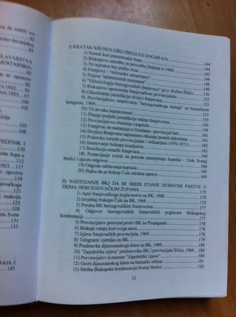 Knjiga od 555 stranica podijeljena je na tri dijela s dodatkom i nekim važnijim dokumentima. Prvi dio nosi naslov "Stajalište franjevaca prema svjetovnom svećenstvu i biskupima u BiH kroz povijest", drugi "Povijesno-kronološki pregled događaja u vezi s podjelom župa od 1881. do 1968", dok je treći naslovljen "Hercegovački slučaj-kronološki pregled događaja i pokušaji rješenja".