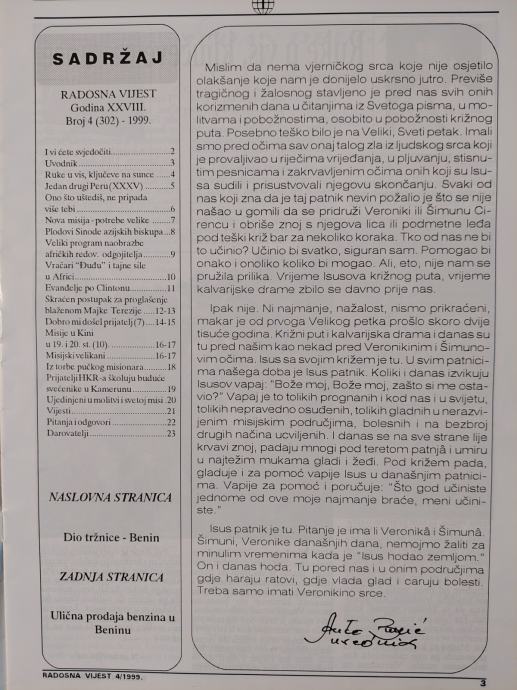 Misijski informativni list-RADOSNA VIJEST 1999.g./Gl. ur. : Anto BURIĆ