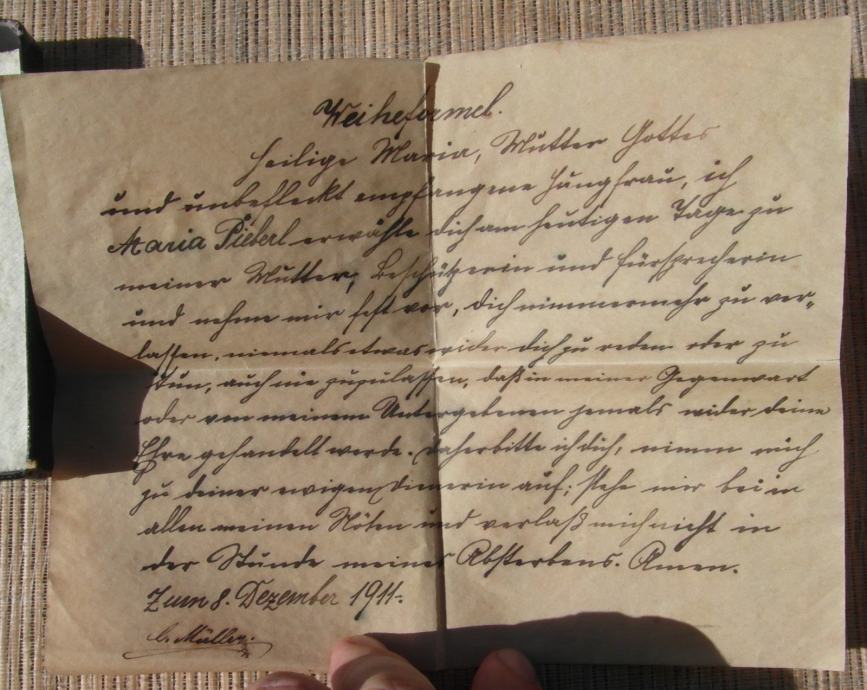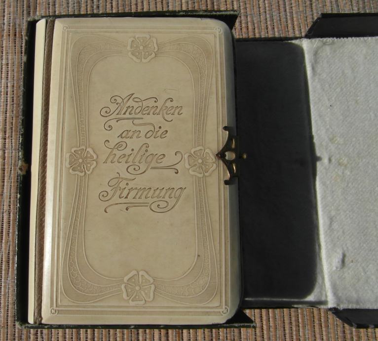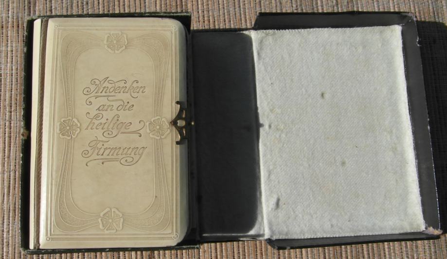 U orginalnoj kutiji, poklon za sjećanje na svetu potvrdu. Obučen u bijelu kožu,vrlo dobro stanje.Uz molitvenik je i jedno staro pismo na njemačkom iz 1911 godine koje ne znam prevesti.