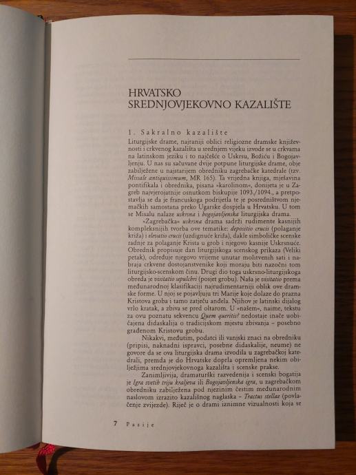 U ovoj su knjizi predstavljena četiri hrvatska srednjovjekovna dramska testa pasionske tematike (Plač Gospoje; Muka Spasitelja našega; Skazan'je slimjen'ja s križa tila Isusova; Uskrsnutje Isusovo). Priređivač Nikola Batušić napisao je uvodnu studiju o hrvatskom srednjovjekovnom kazalištu, a Amir Kapetanović nadodao je tekstološke napomene i izradio rječnik.