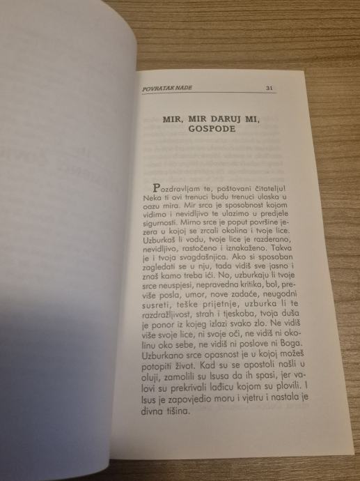 Duhovne misli i razmišljanja iz ove knjige zasigurno će čitatelju pomoći lakše broditi kroz brojne “scile i haribde”. Autorove nadahnute misli, koje nisu izgubile na aktualnosti i svježini od trenutka kada su bile prvi put izgovorene na telefonskom govornom automatu, a potom i prenesene na papir i ukoričene, odvest će čitatelja u oazu mira i nadahnuti ga za životvornu molitvu, otvoriti mu obzorja spoznaje čudesnosti svijeta u kojem živimo.