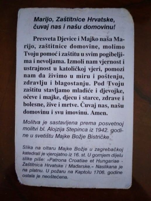 NA POZADINI SLIČICE MOLITVA SASTAVLJENA PREMA POSVETNOJ MOLITVI BL. ALOJZIJA STEPINCA IZ 1942 GODINE U SVETIŠTU MAJKE BOŽJE BISTRIČKE