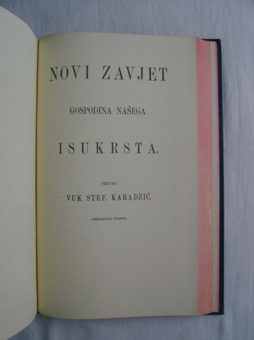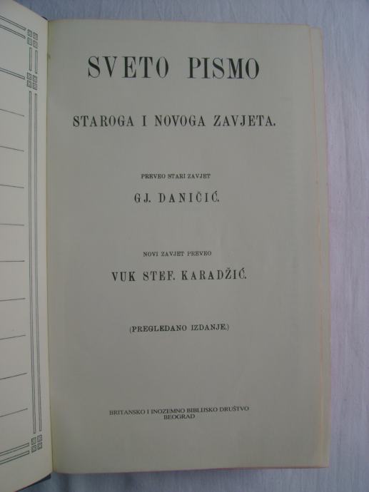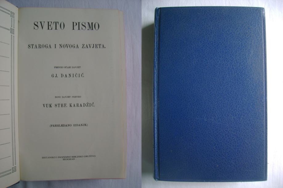 Sveto pismo Staroga i Novoga zavjeta (Biblija) - preveli G.J. Daničić (Stari zavjet) i Vuk Stefanović Karadžić (Novi zavjet), izdavač Britansko i inozemno biblijsko društvo, Beograd 1985. godine, 15 x 23 cm, tvrdi uvez, 731 + 231 stranica.