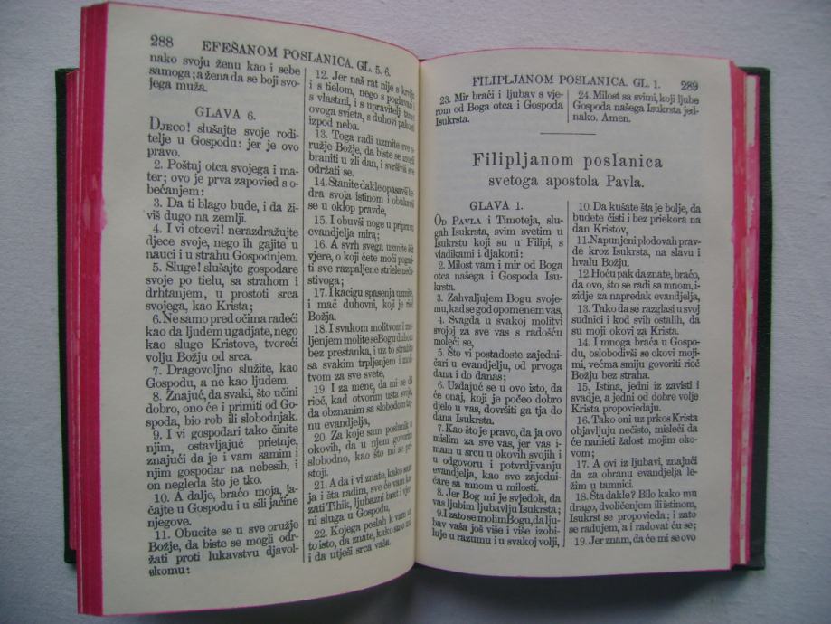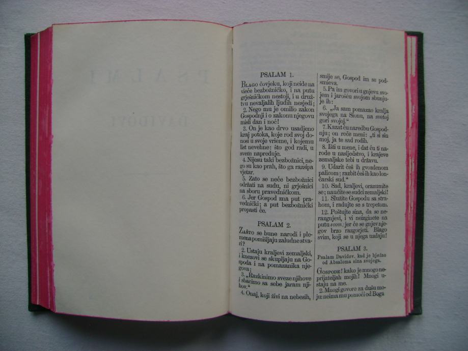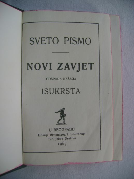 Novi zavjet i psalmi - Sveto pismo / Novi zavjet Gospoda našega Isukrsta - izdanje Britanskog i Inostranog Biblijskog Društva, Beograd 1967. godine, 9 x 13 cm, tvrdi uvez, 378 + 101 stranica.