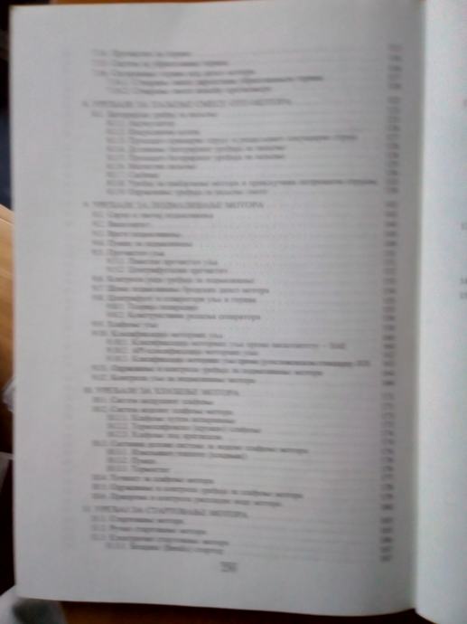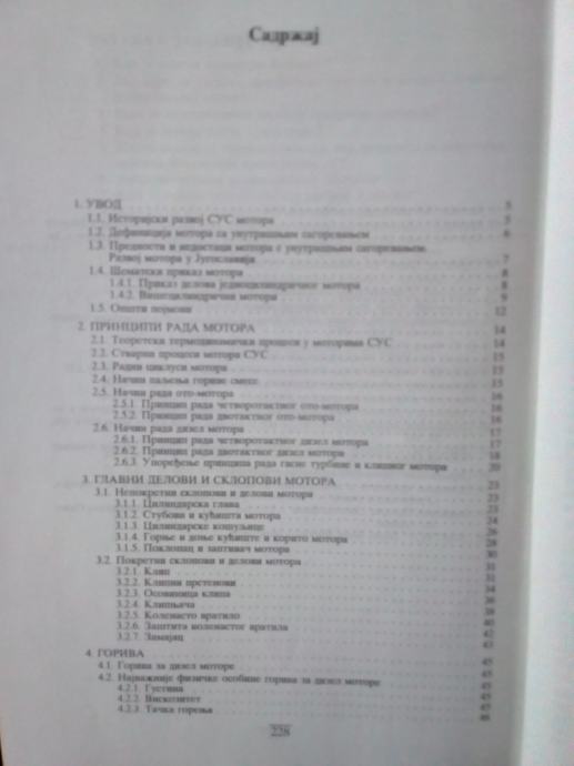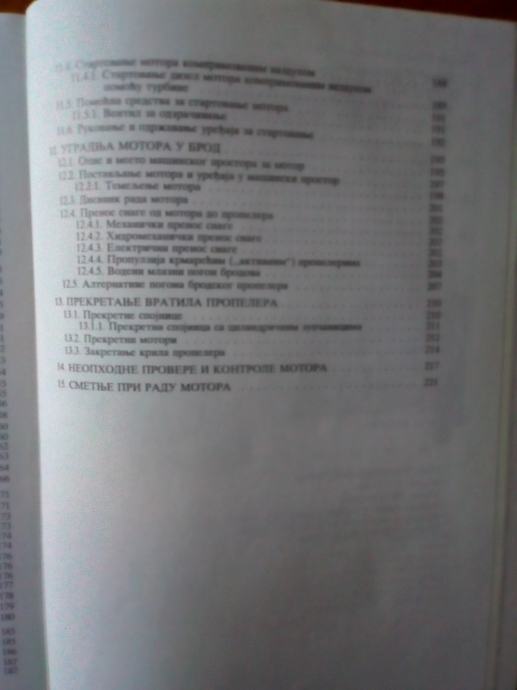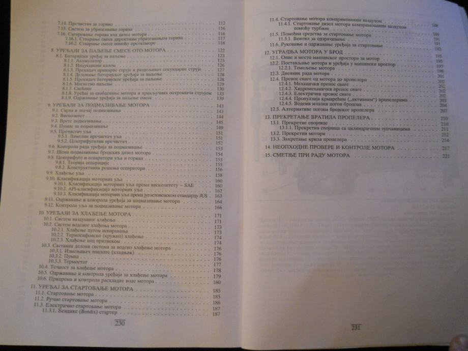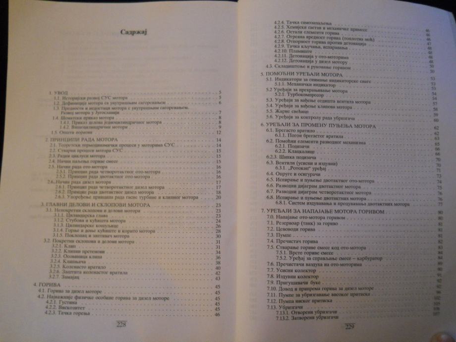 Uvod - motori, brodski motor, principi rada motora, glavni dijelovi i sklopovi motora, goriva, pomoćni uređaji motora, uređaji za promjenu punjenja motora, uređaji za napajanje motora gorivom, oto motori, uređaji za hlađenje motora, uređaji za startovanje motora, ugradnja motora u brod, prekretanje vratila propelera.