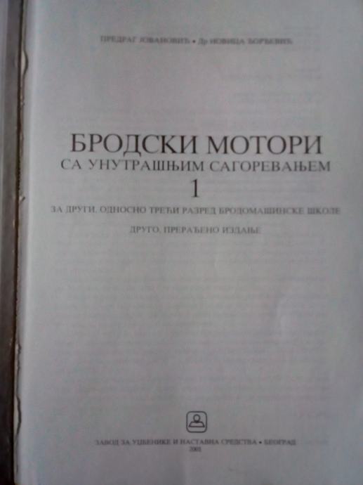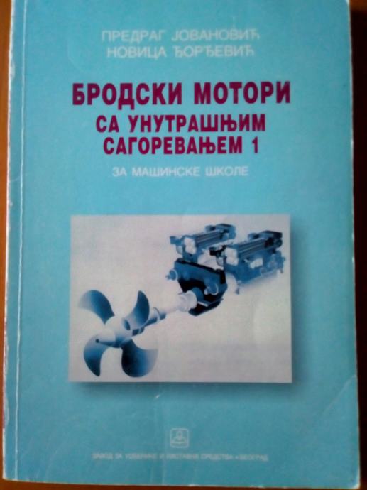 BRODSKI MOTORI sa unutrašnjim sagorevanjem 1, za 2. i 3. razred brodomašinske škole ( P. Jovanović, N. Đorđević), Zavod za udžbenike Beograd, 2001., format 17 x 24 cm , ćirilica, str. 235, meki uvez, 10,00 € / 75,35 kn, prodajem.