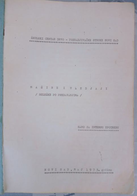 6. MAŠINE I UREĐAJI, skripta (Bilješke po predavanjima), Školski centar drvoprerađivačke struke Novi Sad, 1973., str. 178, meki uvez, 6,00 € /