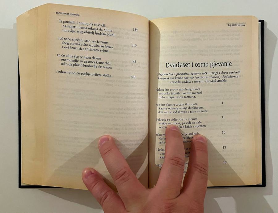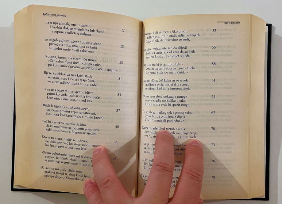 Božanstvena komedija sastoji se od tri dijela, Pakla (Inferno), Čistilišta (Purgatorio) i Raja (Paradiso), koji redom imaju 34 (uvodno pjevanje i još 33 pjevanja), 33 i 33 pjevanja, a ukupno čine preko 14,000 redaka. Prvi dio komedije, Pakao, najpoznatiji je te se često objavljuje odvojeno pod nazivom “Danteov Pakao”. Broj 3 kao simbol iznimno je važan u ovom djelu – dužina djela (po 33 pjevanja), strofa kojom je spjev pisan je tercina, tri zvijeri napadaju Dantea u uvodnom pjevanju, a broj tri također je i simbol Svetog Trojstva. Važnu ulogu ima i broj 100, koji je bio smatran savršenim brojem (uvodno pjevanje i tri dijela po 33 pjevanja).