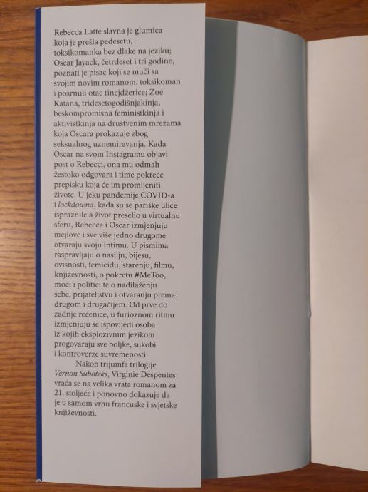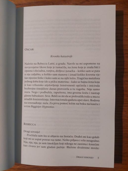 Autorica trilogije „Vernon Suboteks” u svome novom, epistolarnom romanu aktualizira društvene probleme u postpandemijskom svijetu poput rodne, klasne i dobne diskriminacije te ovisnosti o lijekovima i opijatima u medijskoj i filmskoj industriji. Okosnicu radnje čini online prepiska između Oscara, četrdesetogodišnjeg pisca u stvaralačkoj krizi, i „ocvale” pedesetogodišnje glumice Rebecce kojoj on na svom instagram profilu predbacuje odnos prema starenju.