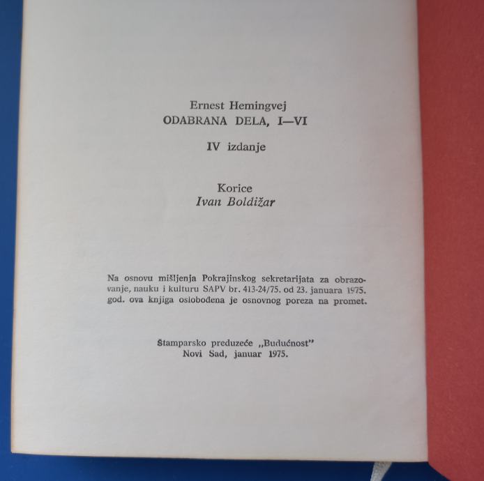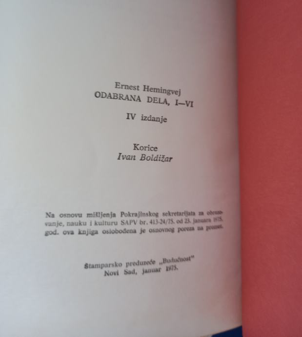 "Odabrana dela, I–VI" Ernesta Hemingveja, četvrto izdanje, izdano u Novom Sadu 1975. godine.
