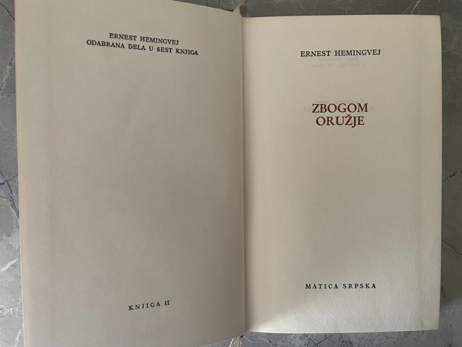 Iz tog njegvog iskustva nastao je roman Zbogom oružje. Hemingwayev opis rata nezaboravan je. On potpuno uvjerljivo oživljava strah, drugarstvo, hrabrost mladog američkog dragovoljca, muškaraca i žena koje upoznaje u Italiji. Ali Zbogom oružije nije samo roman o ratu. U njemu Hemingway slika i dramatičnu ljubavnu priču beskompromisne strasti.