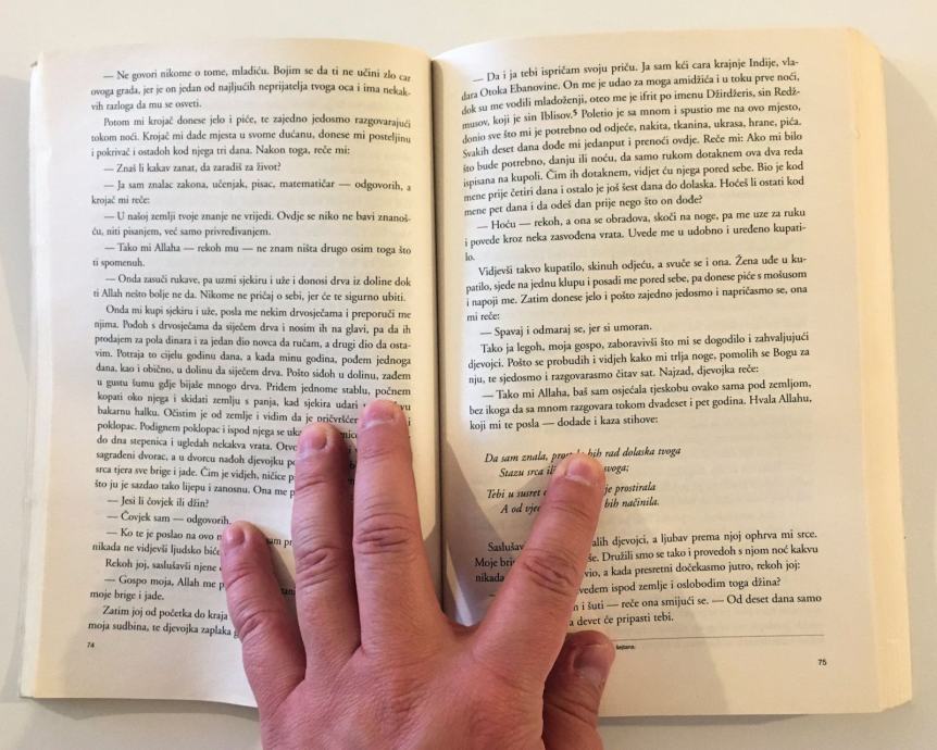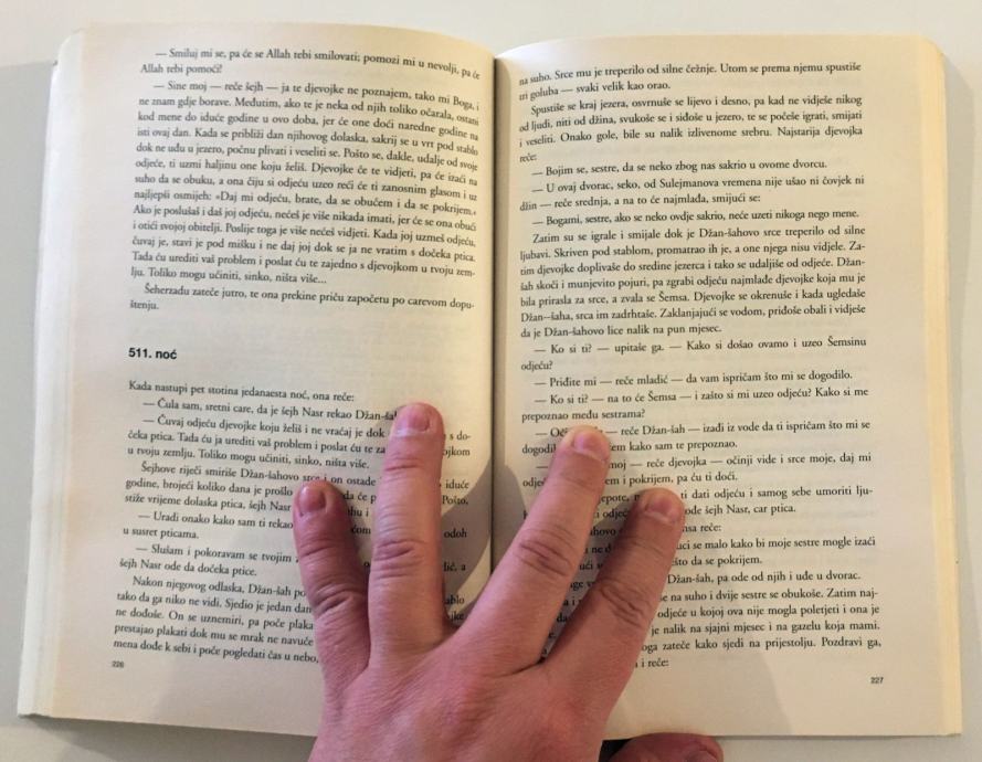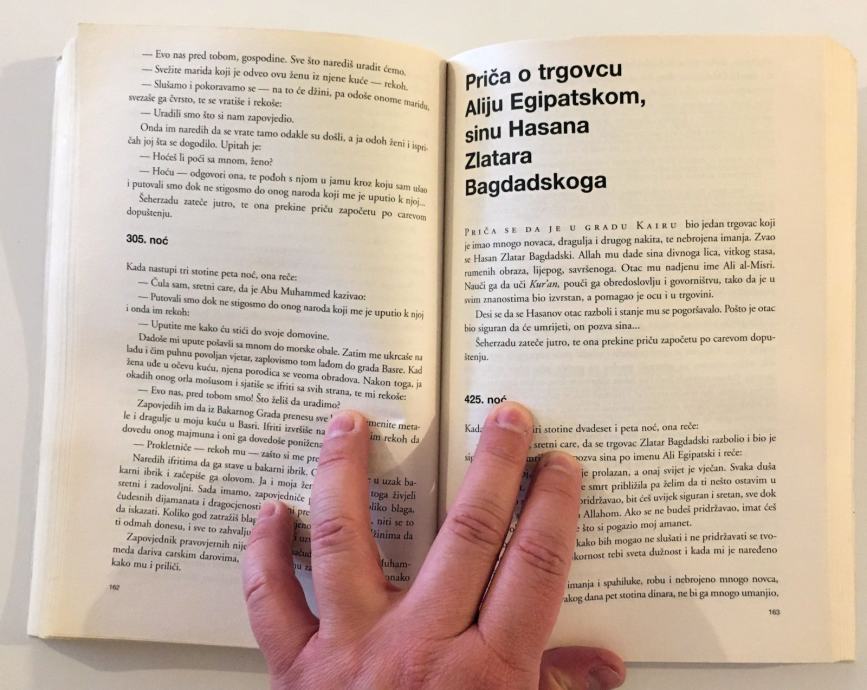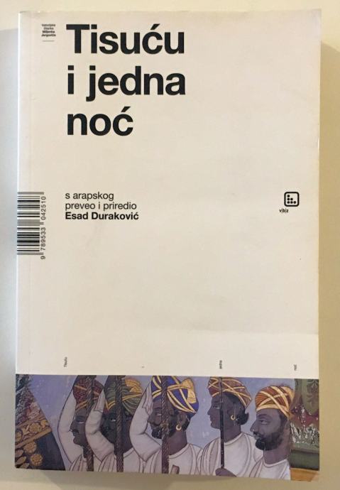 Knjiga s naslovom ”Tisuću i jedna noć”, istina nepotpuna i raščerupana, stigla je u Europu prvih godina njezinoga osamnaestog stoljeća. Donio ju je sa svoga posljednjeg putovanja po Srednjemu istoku siroti i neshvaćeni francuski entuzijast, da bi je potom počeo i prevoditi, onako za svoju dušu, i bez svijesti o tome da bi taj njegov prijevod mogao nekome biti važan. Prvi svezak pojavio se 1704., a u sljedećih desetak godina izašlo ih je još jedanaest. Stotinjak i više godina kasnije objavljivani su cjelovitiji i precizniji prijevodi na engleski, pa na njemački, da bi se tokom dvadesetog stoljeća ”Tisuću i jedna noć” razlistala u dugom nizu posrednih izdanja, prijevoda s većih i poznatijih europskih jezika, te prepričavanja, reinterpretacija, remake varijanti i prilagodbi različitim potrebama. Ili jednoj vazda istoj ljudskoj potrebi za pričanjem priče. Zapadni mit o ”Tisuću i jednoj noći”, dostojan spomenik izvorniku, stvorio je Jorge Luis Borges. Ali istovremeno su nastajali i lakopotrošni, industrijski mitovi iz trafika i iz tvornica umjetnih dječjih svjetova, od kojih je najpoznatija bila ona velikoga Walta Disneyja. U vrijeme kada bi dječak stasao do svoga prvog Borgesa, Ali Babu, Šeherzadu, Aladina i Sinbada već je poznavao preko Politikinog zabavnika. Pomirenje tih dvaju svjetova, onog koji je započinjao rubrikama Vjerovali ili ne i Jeste li čuli da, Mikijevim stripom i Dikanom i Starim Slavenima, i onog koji je snagom imaginacije i nizom svojih čitateljskih otkrića stvarao genijalni slijepac, bilo je važan imperativ odrastanja. ”Tisuću i jedna noć” velika je i neobična knjiga, koja nipošto ne traži da se u ime Borgesa odbaci Politikin zabavnik. Iz pogovora Miljenka Jergovića. S arapskog preveo i priredio Esad Duraković