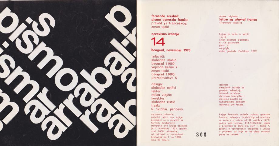 Fernando Arrabal: Pismo generalu Franku, Nezavisno izdanje Slobodan Mašić-Zoran Tasić, Beograd 1973.