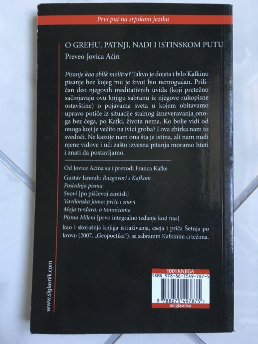 Kafkino pisanje je bilo „oblik molitve“. Priličan deo njegovih meditativnih uvida (koji pretežno sačinjavaju ovu knjigu sabranu iz njegove rukopisne ostavštine) o pojavama sveta u kojem obitavamo upravo potiče iz situacije stalnog izneveravanja onoga bez čega, po Kafki, života nema.