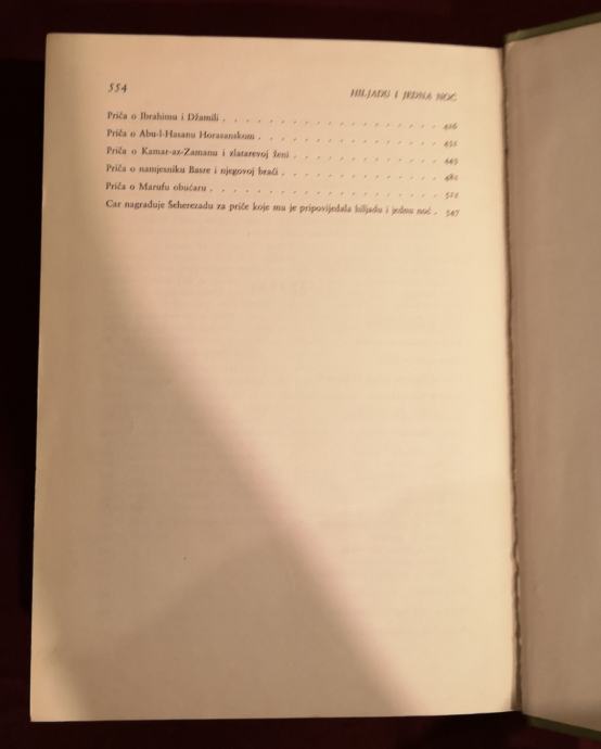 DANAS ZBIRKA ARAPSKIH PRICA IZ HILJADU I JEDNE NOCI JEST SVJETSKI KLASIK JER JOS OD DESETOG STOLJECA DO DANAS NE JENJAVA INTERES CITATELJSTVA ZA OVIM DJELOM KOJE JE NADASVE INTERESANTNO I RELAKSIRAJUCE JER SU PRICE SLOZENE KAO SALJIVE..U ANEGDOTAMA..KAO LEGENDE..I DR...... PRICE IZ OVE ZBIRKE IMAJU OBLIK NEOVISNIH.. TEMATSKI ODVOJENIH PRICA.. A ZAJEDNICKO IM JE TO STO IH SVE VEZIROVA KCER SEHERZADA PRICA PERZIJSKOM KRALJU SAHRIJARU I TO SVAKU NOC DRUGU PRICU TE TAKO SPASAVA ZIVOT SVOJ I DRUGIH DJEVOJAKA U KRALJEVSTVU A POSLIJE HILJADU I JEDNE NOCI CE RODITI KRALJU PRIJESTOLONASLJEDNIKA.................... S ruskog preveo Marko Vidojkovic.. u sve tri knjige imaju ukupno 1554 stranice...... po komadu knjiga kosta 13,- E.. a komplet II.. III.. i IV dio kosta 30,-E..( I.. je prodana).. Nazvati.. 099 557 00 00..hvala