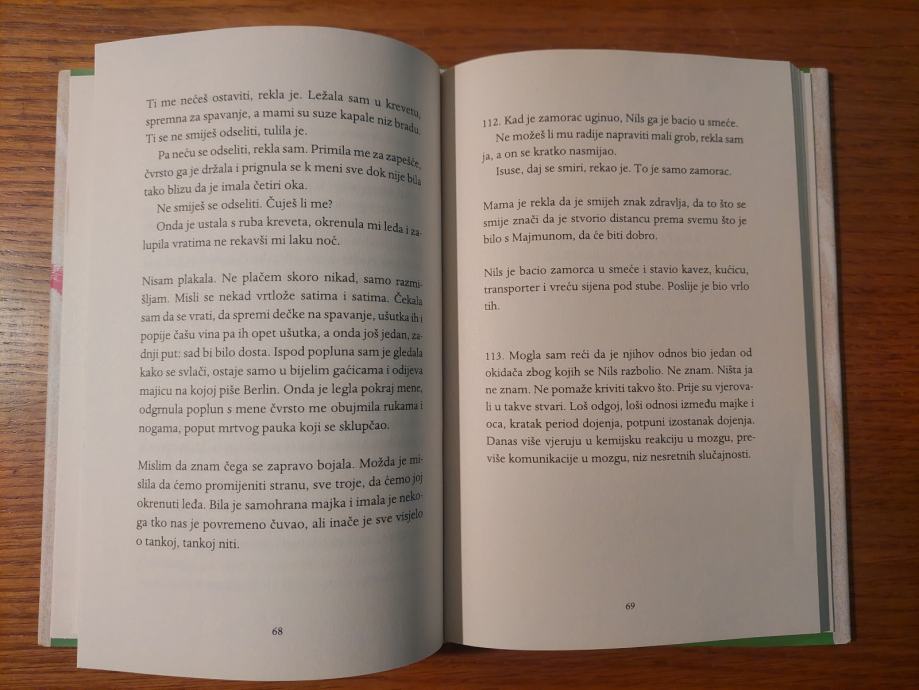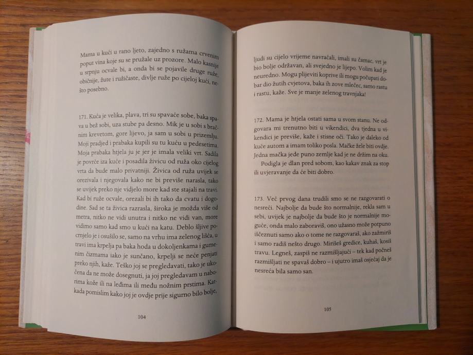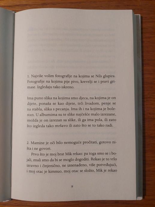 Samoubojstvo mladića Nilsa zauvijek je promijenilo živote njegovih bližnjih. Kroz kratke fragmente, njegova sestra progovara o boli koja je uslijedila nakon tog tragičnog događaja, a prisjeća se i zajedničkog djetinjstva te detalja iz Nilsova života i obiteljske prošlosti. Norveška autorica za ovaj je roman osvojila Oslo Prize i Nagradu EU za književnost.