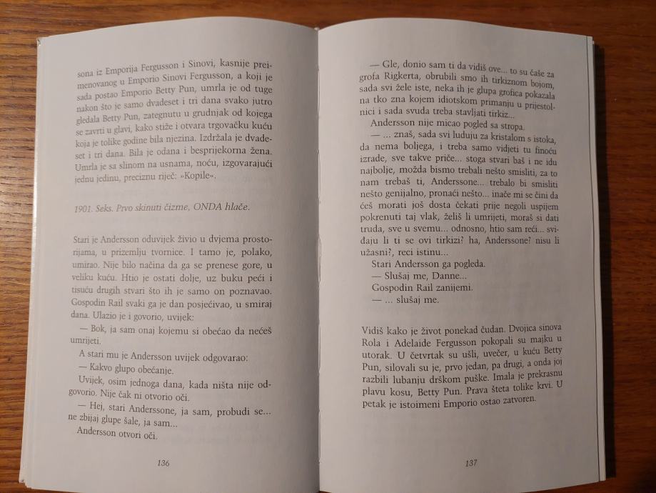 U ovom se romanu prepliću radnje i zbivanja, više je likova čije su sudbine različite ali ih povezuje neka osobita čulnost kojom ih autor opisuje. Osobina je ovog autora da nam intuicijom približi svoje junake i pri tome bude izravan i točan. Neke se stvari događaju bez naših utjecaja a odgovore na njih dobijemo uvijek, samo ponekad sa zakašnjenjem.