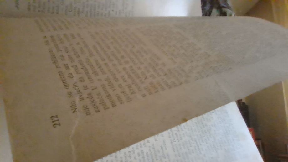KORICE IMAJU DOSTA OŠTEĆENJA I MRLJA, TRAKA PREKO HRPTA, MRLJE PRI RUBOVIMA STRANICA I UNUTAR KNJIGE, UGLOVI NEKIH STRANICA SU POHABANI I IMAJU MANJE PREGIBE, RUBOVI NEKIH STRANICA IMAJU MANJA OŠTEĆENJA, DVIJE STRANICE SU MALO RASPARANE