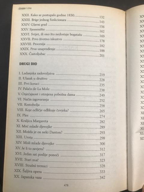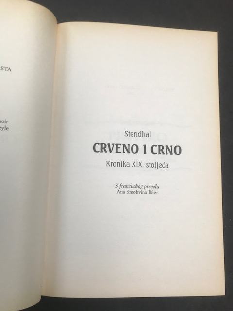 Roman govori o društvenom usponu siromašnog mladića Juliena Sorela u konzervativnom, kontrarevolucionarnom i autoritativnom režimu u doba ponovne uspostave monarhije nakon pada Napoleona i povratka dinastije Bourbona na vlast. Stendhal je, što iz prkosa, što iz taštine, običavao govoriti kako piše tek za malobrojne sretnike (to the happy few) među svojim suvremenicima, ali poglavito za naraštaje koji će tek doći. Pri tom možda ni sam nije ni slutio koliko je bio dobar prorok .(iz tiska)