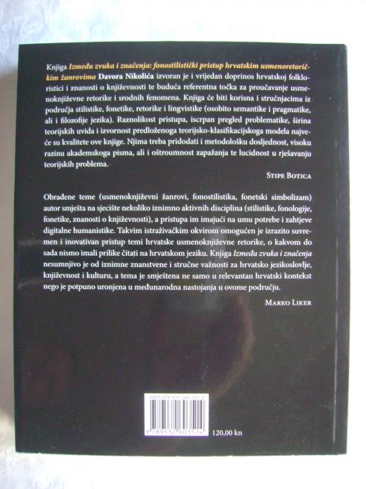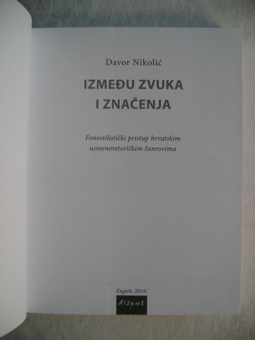 Davor Nikolić - Između zvuka i značenja; Fonostilistički pristup hrvatskim usmenoretoričkim žanrovima - izdavač Disput, Zagreb 2019. godine, 16 x 20 cm, meki uvez sa preklopom, 330 stranica.