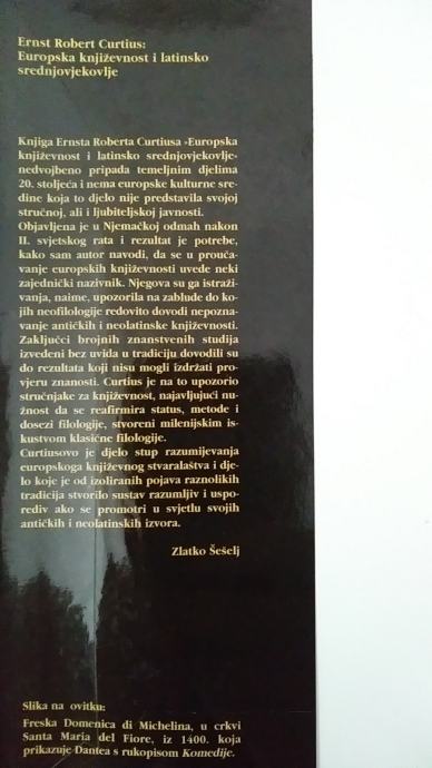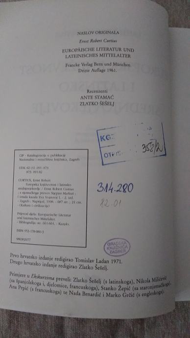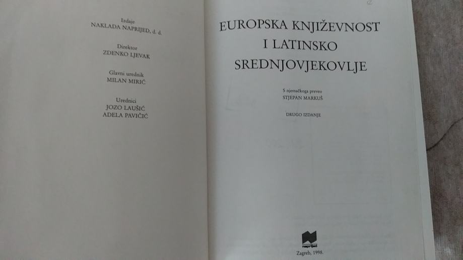 Prodajem knjigu udžbenik „Europska književnost i latinsko srednjovjekovlje", prijevod djela: Europaische Literatur und lateinisches Mittelalter, autor Ernst Robert Curtius, s izvornikom usporedio i redigirao Tomislav Ladan,