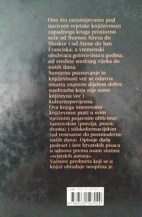 Ono što razumijevamo pod nazivom svjetske književnosti zapadnoga kruga prostorno seže od Buenos Airesa do Moskve i od Atene do San Franciska, a vremenski obuhvaća gotovo tisuću godina, od sredine srednjeg vijeka do naših dana. Sumarno poznavanje te književnosti već se odavna smatra znatnim dijelom dobre naobrazbe koja nije samo književna već i kulturnopovijesna. Ova knjiga prati imenovanu književnost u svim njezinim pojavnim oblicima: žanrovskim (poezija, proza, drama) i stilskoformacijskim (od renesanse do postmoderne naših dana). Opisuje djela pedeset i šest hrvatskih pisaca u odnosu prema osam stotina "svjetskih autora".