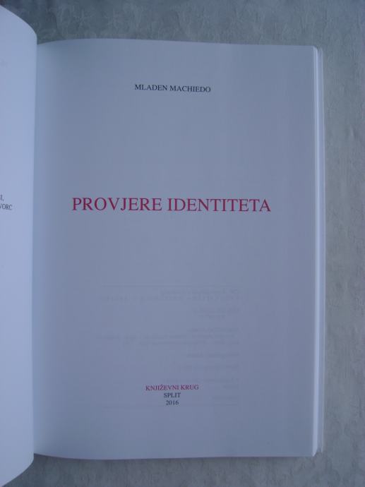 Mladen Machiedo - Provjere identiteta - izdavač Književni krug, Split 2016. godine, 17 x 24 cm, tvrdi uvez, 190 stranica.