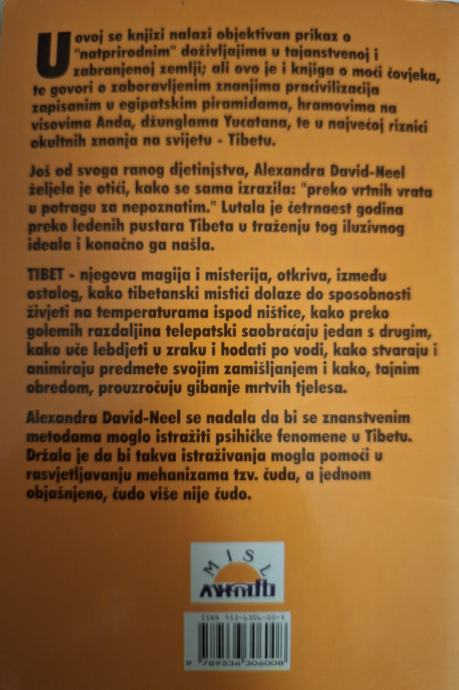 Magija i misterija u Tibetu. U ovoj knjizi nalazi se objektivan prikaz o „natprirodnim“ doživljajima u tajanstvenoj i zabranjenoj zemlji; ali ovo je i knjiga o moći čovjeka, te govori o zaboravljenim znanjima pracivilizacija zapisanim u egipatskim piramidama, hramovima na visovima Anda, džunglama Yucatana, te najvećoj riznici okultnih znanja na svijetu – Tibetu. Još od svoga ranog djetinjstva, Aleksandra David-Neel željela je otići, kako se sama izrazila: „preko vrtnih vrata u potragu za nepoznatim“. Lutala je četrnaest godina preko legendarnih pustara Tibeta u traženju tog iluzivnog ideala i konačno ga našla. TIBET – njegova magija i misterija, otkriva, između ostalog, kako tibetanski mistivi dolaze do sposobnosti živjeti na temperaturama ispod ništice, kako preko golemih razdaljina telepatski saobraćaju jedan s drugim, kako uče lebdjeti u zraku i hodati po vodi, kako stvaraju i animiraju predmete svojim zamišljanjem i kako, tajnim obredom, prouzročuju gibanje mrtvih tjelesa. Alexanrda David-Neel se nadala da bi se znanstvenim metodama moglo istražiti psihičke fenomene u Tibetu. Držala je da bi takve istraživanja mogla pomoći u rasvjetljavanju mehanizama tzv. Čuda, a jednom objašnjeno, čudo više nije čudo.